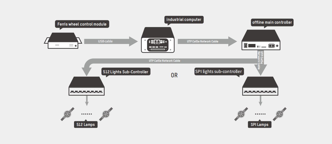 Description:The Ferris wheel control system needs to be used in conjunction with an industrial computer, with a maximum load of 120,000 points; it uses Ethernet interface and UDP network protocol to connect with the lower-level controller, and the effect can be achieved during the rotation of the Ferris wheel. The animation remains unchanged, and the animation effect can also be customized.